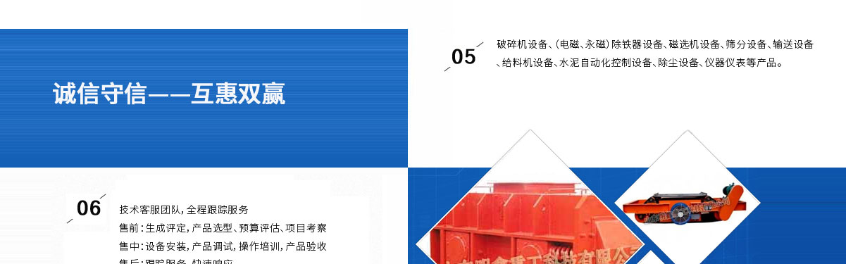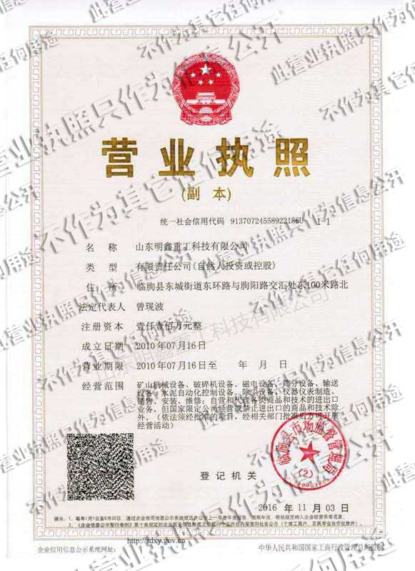 山東明鑫重工科技有限公司為是集科研開(kāi)發(fā),設(shè)計(jì)制造、銷(xiāo)售、安裝、調(diào)試為一體的技術(shù)制造企業(yè)。公司位于美麗的****風(fēng)箏都-濰坊市(國(guó)家AAAA級(jí)森林公園-沂山景區(qū)駐地)臨朐東城工業(yè)園。本公司產(chǎn)品種類(lèi)有:破碎機(jī)設(shè)備,(電磁、永磁)除鐵器設(shè)備,磁選機(jī)設(shè)備,篩分設(shè)備,輸送設(shè)備,給料機(jī)設(shè)備,水泥自動(dòng)化控制設(shè)備、除塵設(shè)備,儀器儀表等產(chǎn)品。其產(chǎn)品有五十多個(gè)系列,四百多種規(guī)格,并可根據(jù)客戶(hù)需求設(shè)計(jì)生產(chǎn)相應(yīng)的產(chǎn)品。其產(chǎn)品廣泛應(yīng)用于冶金、電力、煤炭、礦山、造紙、食品、化工建材、耐火材料、磚瓦、水泥、玻璃等行業(yè),產(chǎn)品暢銷(xiāo)國(guó)內(nèi)三十多個(gè)省市、自治區(qū)。